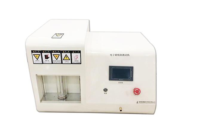 本機是用來測試成品電子煙、電子煙電池桿、電子煙霧化器等一吸一停所得之口數。能精確的控制每口的抽吸容量,觸摸屏控制及設定相關參數。其原理是設置好每口抽吸容量、抽吸時間、抽吸間隔時間、循環次數等參數后對產品一吸一停如此反復循環直至:電池耗盡(下降到一定的電壓)、煙油消耗完畢、或發熱絲燒斷等不再正常工作后所得的次數,以此研判電子煙的使用壽命,并加以改良。